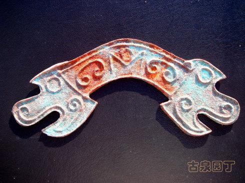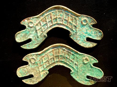 目前发现的磬币有两种:一种整体为磬币或桥状平板,无纹饰,一种两端作兽头状,有图案纹饰或文字。其宽度约为20~30mm,两端直线距离约为70~110mm,大量出土于春秋末战国初的墓葬或窖藏,出土时一般是成摞压叠放置,或与钱币位置相连。流行于春秋战国,多见于墓葬,纹饰复杂多样。是否应定为货币,还存在争议。