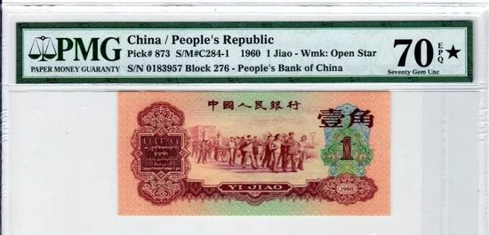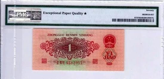 据知,这是迄今为止第一枚70E带星枣红,也是唯一一枚70分枣红。枣红壹角本身也是三版三珍之一,而且发行最早,存世稀少。绝品裸币现价5000元以上。评级币依分数不同价格也有很大差异。