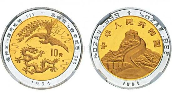 ▲1994年龙凤双金属币双金属币发行量少,而且铸造很困难。