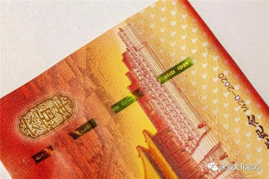 纪念券采用手工雕刻凹印技术,高清专用水印纸张,动感光变开窗安全线,红外对印、缩微文字、多种荧光套印、丝网光变、AR增强现实等十余种印钞造币独有的钞币设计与印制技术。尤其是双色凹印荧光油墨印刷,是该工艺在纪念券里的第一次应用;江崖海水纹采用胶印专色印刷,四种颜色线条水纹在日光下精准套印,在荧光灯下呈现四色炫彩效果。