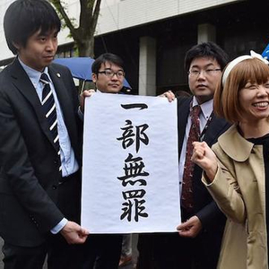 2016年5月9日在东京法院前五十岚惠律师手拿“无罪”横幅