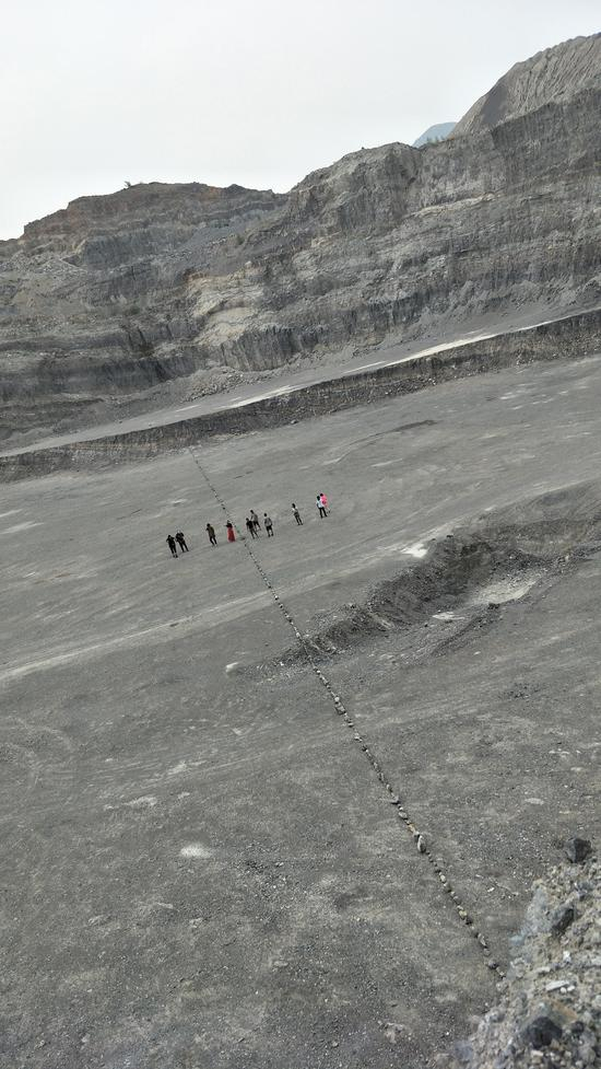 《一条线》是最简单又最艰难的作品,五百多块石头,十个人搬了两个小时。王轶琼前些日子已经画过一幅十米长的作品,里面画的就是排成一条线的玉石,算是给今天的现场行为构思了一个草图吧。在人为破坏的山体间,艺术家又加筑一道涵义无限的新山水,指向昨天,引导明天。