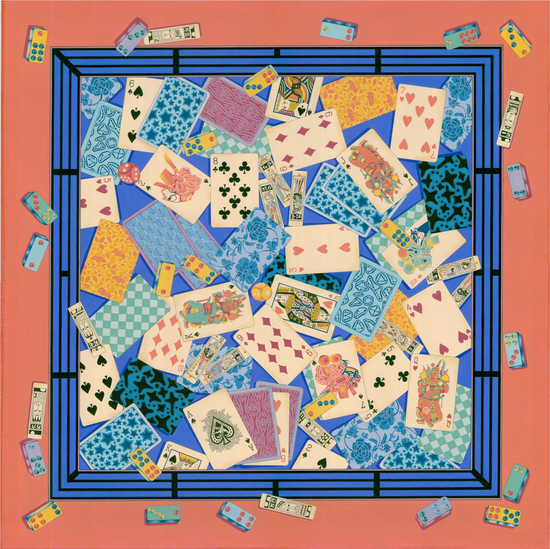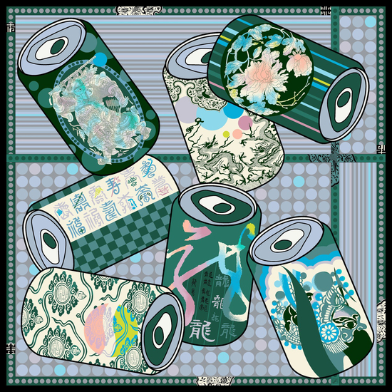 在艺术家张宝华的丝巾创作中,无论是市井中的扑克、色子,易拉罐,青山上姿态伸展的幽兰松柏,还是带有神秘意味的图腾与雕塑,都被丰富的色彩赋予了另外一层含义,一种蕴含中国传统气息的现代主义设计。用最具有东方艺术魅力的视觉元素,挖掘着文化精髓和现代生活的生命力,也赋予着这些元素来自历史的美好的寓意。