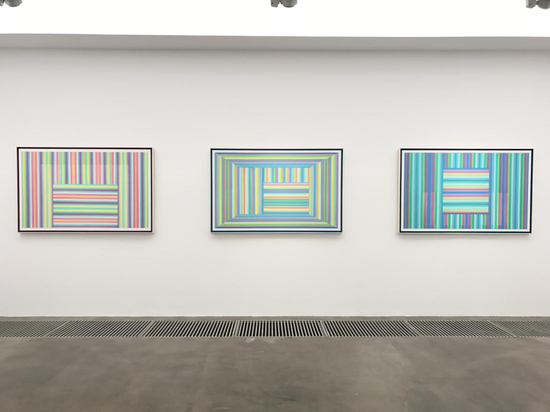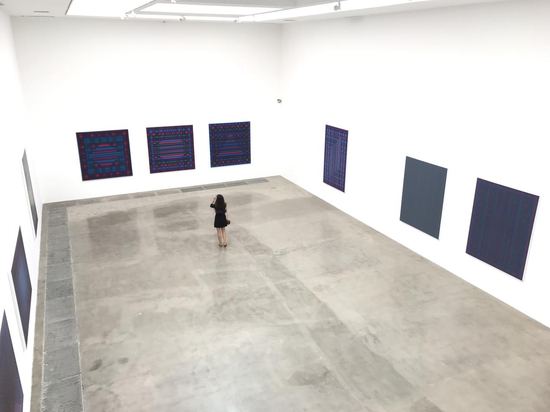 与此相关,在另一个层面上,他的艺术又是一种对绘画历史逻辑的重新考量与再次出发,他基于绘画的物理边界与观念限度,调度着等诸多绘画语素,如平面性上的水平/垂直、清晰/模糊关系与色彩性上的亮/暗、纯/灰、冷/暖关系,以及空间上的前/后、图/底关系,“编织”出了一系列绘画“文本”。