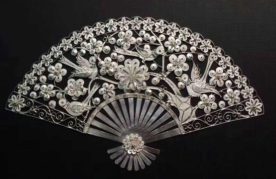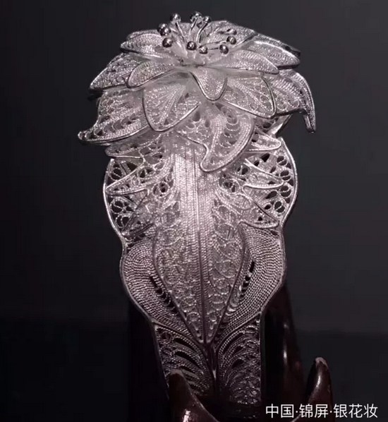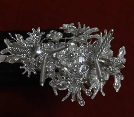 北侗银饰工艺种类较多,最为体现其艺术水准价值的要数“银花妆”手工拉丝工艺与乱丝工艺,手工拉丝工作是银饰锻制技艺中最为精湛的工艺,展现了银饰加工的最高水平,同时也蕴含了粗犷中细腻的精致,经过36道工序,将一块银原料手工制成一款三层拉丝掐花成品,丝细如发,没有任何的焊点,巧夺天工。