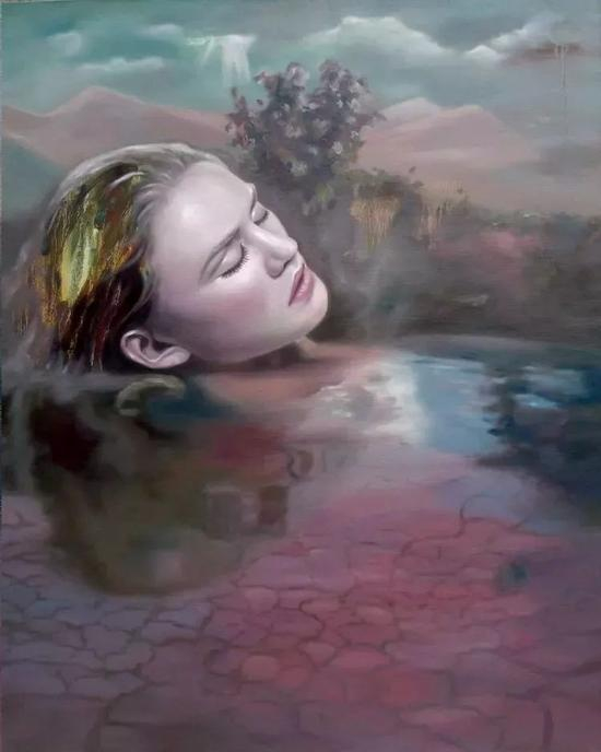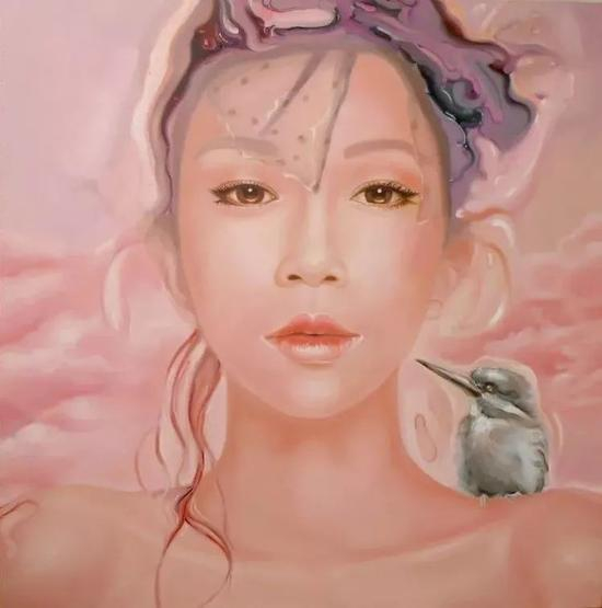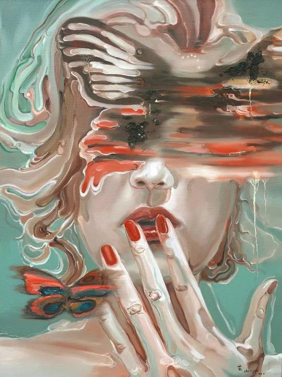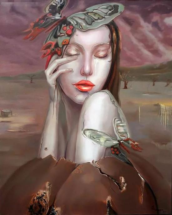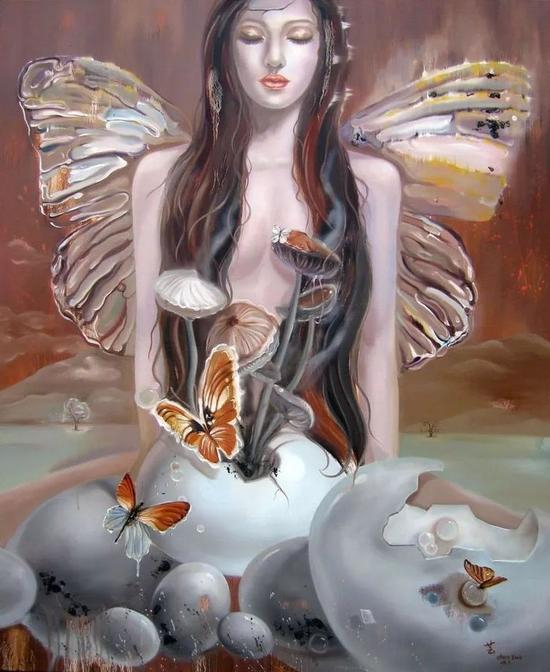 与《面孔》系列中蝴蝶主要作为一种隐喻而存在不同,在陈芸的《蝶变》中,蝴蝶与人物是并存的,或者是人背后生长出蝴蝶的翅膀,或者是同时出现、相互辉映;与《面孔》更直接地呈现内心体验相比,《蝶变》也多出了许多曲折,在人物具体的情态背后总是隐含着从蛹到蝴蝶的痛苦蜕变的意象。在通常的理解中,从蛹到蝴蝶的蜕变过程是痛苦的,更是美丽的,是生命在剧烈的疼痛中的升华。然而,在陈芸的作品中,经历了剧烈的痛苦之后,人物所呈现出来的却是更深的忧伤与失落——这是被铁一样冷硬的现实挤碎温馨、曼妙的青春梦想之后的巨大失落,是敏感、热情的生命猝然遭遇令人窒息的生活世界时的彷徨无措。