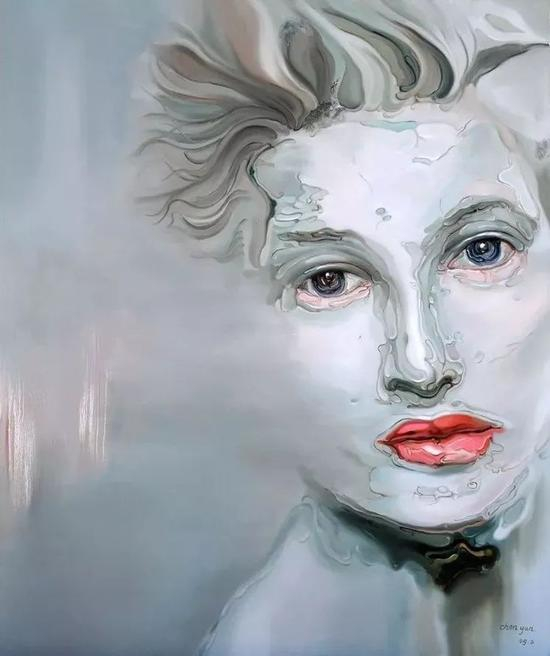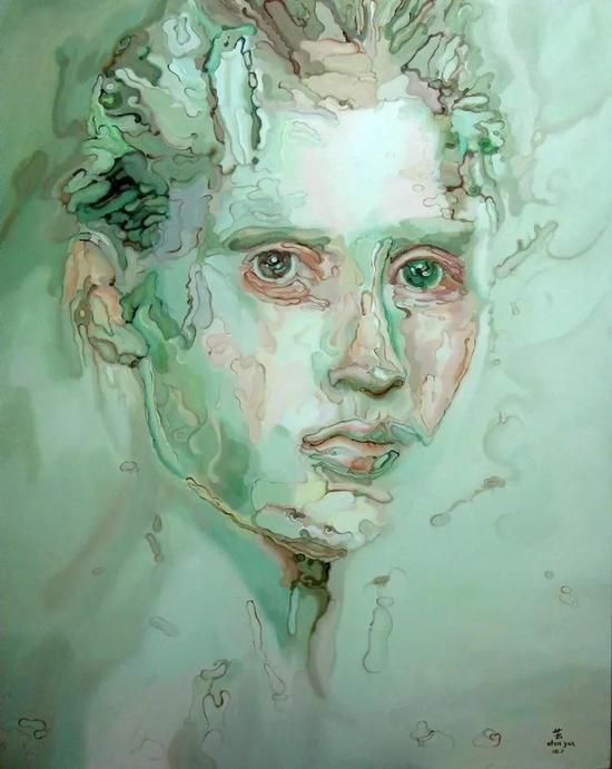 《面孔之八》也是两个面孔的叠合——两张面孔共用三只眼晴——作品的意象不像《面孔之七》那样有着诡异的魅惑力,但流淌的笔触、凄美的色彩和黯然神伤的表情悚然心惊地呈现出一种痛苦得无法自持的情状。