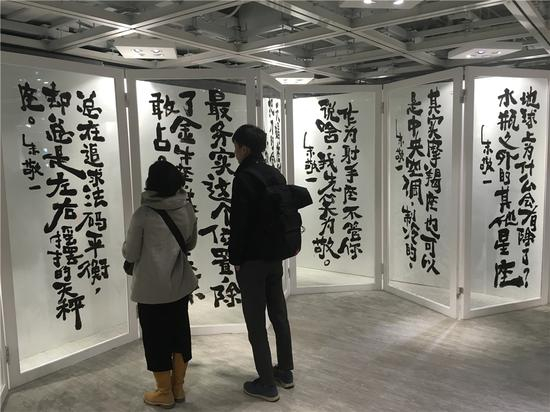 “迷宫”主题展区中,几十条人生箴言,或暖心、或扎心,或豁达、或幽默,让观众能从这些“毒鸡汤”里不断体会到各种人生况味。在互动荧光绘画区域,观众可以用手电在荧光布上“写”下自己的书法作品,字迹会在布面上停留约半分钟,观众可以用照片留下自己的“墨宝”。