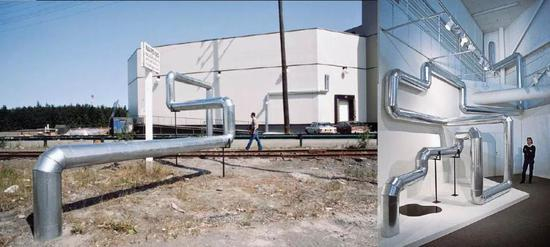 NH:在里面,作品《管线》在渗油,滴到楼板上的坑里,它表现阿拉斯加的渗油管道。那年我应邀访问阿拉斯加,去采风,我被那里的事物彻底感动了!管道在大地上穿进穿出,翻山越岭,横跨湖泊。同时我也了解到这些管道没有好好地完善和维护,到处在锈蚀,在遭受严寒冰冻,所以到处都在渗漏,污染那里的原始环境。作为回应,我在安克雷奇艺术博物馆做了我自己的管线作品。作品的一部分在室外,一个片段跨过铁路形成拱门样子,然后钻入地下,到了博物馆的入口时管线又冒出地面构成了大拱门供观众通过,然后在角落蜿蜒几下之后“刺穿”大楼;在楼里,几乎在同样的位置,管道曲折几次后慢慢地从很高的天花板上延伸下来。最后,就像阿拉斯加的管线一样,用的是一根软带子将其固定住,就在固定的地方,油在泄漏。它本来也是个计时器,每个小时有多少滴油滴入小坑里。那座博物馆部分的赞助来自石油公司,所以博物馆的管理者和主任很热心这项工作,很支持我。