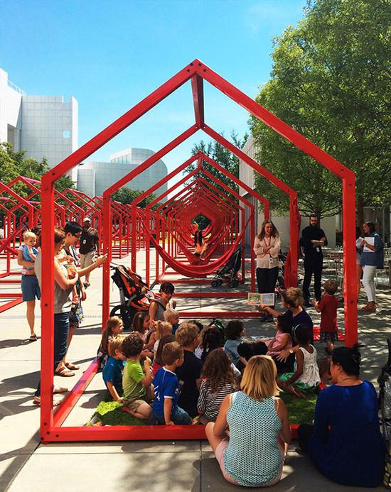 墨西哥设计师Héctor Esrawe和Ignacio Cadena建造了“Mi Casa-Your Casa”(我的家,你的房子),它是一个交互式设计装置,位于位于格鲁尼亚,亚特兰大半圆艺术中心Siftly广场。该项目是“住宅项目中的设计师”的一部分,“Mi Casa-Your Casa”是一处欢迎空间,安装了40个房子形状的三维立体框架,红色的“房子”在室外显得格外显眼。在这里,游客们可以玩耍,创造和放松,在游戏的时间里,人们一般会在这里搭建吊床,玩秋千,画画,吹泡泡等。Woodruff(剧院联盟,亚特兰大交响乐团和艺术学习联盟)会在借用这一装置进行表演,以教育更多的青年。这些独特原滋原味的合作,会让游客们体验到亚特兰大中最引以为豪的艺术家和他们的新组合们。当这些艺术家们探索新的领域时,他们也在不知不觉中,将生活的艺术带入广场之中。