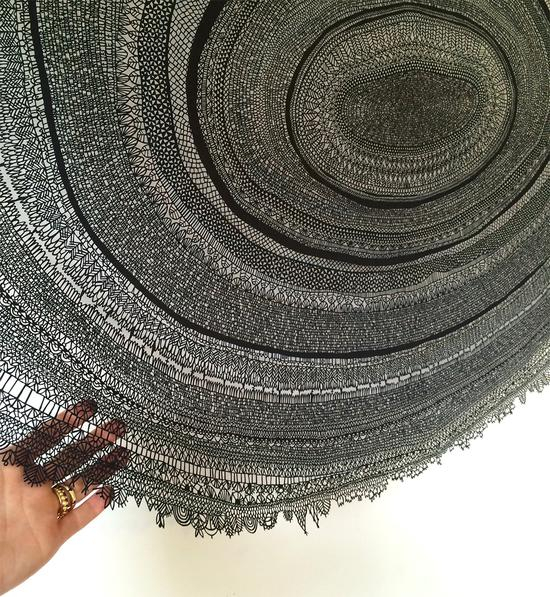 Annie Vought的作品,部分呈现为蕾丝的形态,但材料本身并非蕾丝布料。她将平常收集到的信件,笔记中的文字放大并且重新创造,用刻刀和纸将平面的文字变成一件雕塑作品。Annie Vought 选择用纸作为媒介,将书写者的记忆、性格、当下的情绪、所花费的时间,以一种全新的方式呈现在观者面前。她的作品既表达了纸的坚韧,同时具备了蕾丝的脆弱美;纸的局限,以及形态上那种稍纵即逝的美感,暗示着文字表达的局限。而书法作为一门古老的书写艺术,何尝不是如纸般脆弱又坚韧。在电子媒介的冲击下,书写成为一种奢侈,却也因为字里行间所包含的温度,而无可取代。Annie Vought选择用纸表现文字和语言之美,将书信中的逐字逐句一一雕刻,灯光在作品上打出的阴影,映射在墙上,文字与纸张突破了本身的界限,使阅读有了另一种观看经验。