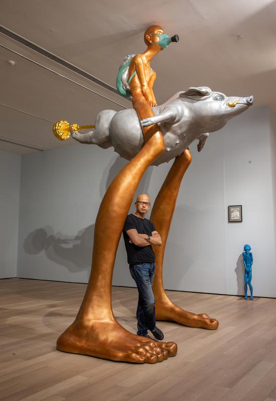 我想任何的社会现实都应该有真正的记录者和反思者,遗忘就容易重蹈覆辙和引来背叛。假疫苗这一恶迹令我愤怒之余又脑洞大开,“超常规”这件雕塑装置作品应运而生。我将前后相距近二十年的两件看似不相干的旧作生猛地砸在一起,一件充满人性正能量的红男孩狠狠地怼在一个充满迷狂拜物主义的抱猪男肩上,顿然产生了一种强大的视觉场域和时代特质。这是我将自己各个时期的所有作品作为现成品或新元素进行超常规的解构与重建的创新性尝试。从而产生一件件具有新语义和新所指的作品。