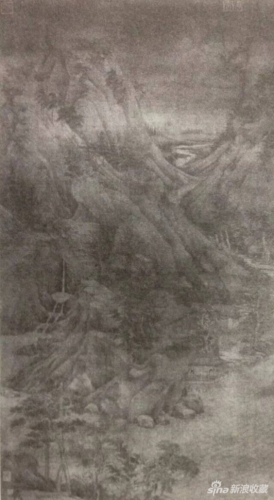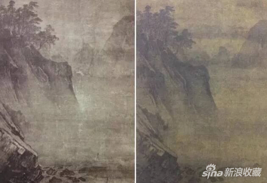而在1997年,此画再次展出时经过重新修复后,作品绢底被清洗和提亮。还有原来的笔墨被强化了(下图)。这些处理是在相当长的一段时间内,由不止一位修复专家逐渐完成的,所以一旦完成,就不可能再回到从前。不过,就因果关系而言,是彻底清洗后使得画面清晰,笔墨层次明显了。