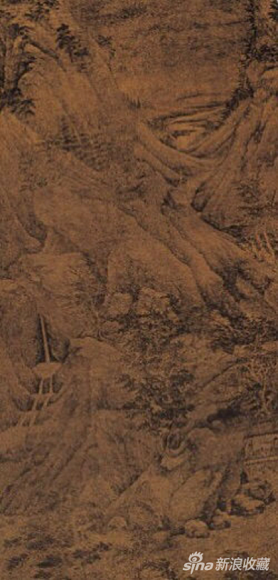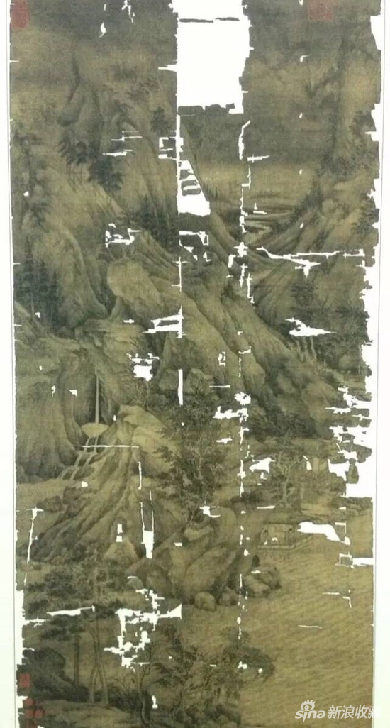 大都会对《溪岸图》的拍摄,照片显示现在已十分残破,画面黯淡失色,还有的局部已完全失落了。只能在几英寸的距离内之内,非常努力的辨识,才能看出画上的内容。绢面的磨损如此严重,以至于完全无法把握皴擦的笔触和用墨的层次。“