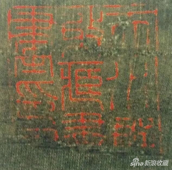 《溪岸图》共有十九枚收藏印,其中十二枚是二十世纪,张大千、张善孖、王己千所钤。余下七枚为古印,葫芦“悦生”(残)、“秋壑”长方印属南宋贾似道,不过和已知“秋壑”真印不同。一枚“天水郡收藏书画印记”、三枚柯九思私印、一枚洪武内府“典礼纪察司印”半印。其中“天水郡收藏书画印记”(下图)学术界普遍认为是南宋宗室赵与懃的收藏章,也有一种观点认为是赵孟頫。