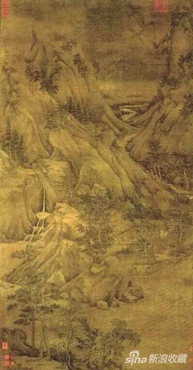 《溪岸图》,绢本,设色,纵:221.5厘米,横:110厘米。绘隐士的山居生活:两座山之间的山谷,有溪水曲折蜿蜒而下,汇成一个波纹涟漪的溪池。池岸有竹篱茅屋,后院有女仆在劳作,篱门前有牧童骑牛,小道上有农夫赶路,一亭榭伸入水中,高士倚栏而坐,举目眺望,其夫人则抱儿与仆女嬉戏于旁。屋后山腰有悬泉拾级而下,至山脚汇集于溪池。水流及涌波以细线勾画。山石以淡墨勾皴,重在以淡墨层层渲染,很少加点,而用浓墨染山石之交接处以醒出结构。山体均不高峻,而其形态,则似大浪涌起,数座山峰齐向左似排浪涌动,这却是前无古人的。浪头之崖巅,前后堆叠,望去隐约有“矾头”之形态。而向下的悬崖,则似侧倾的浪谷。