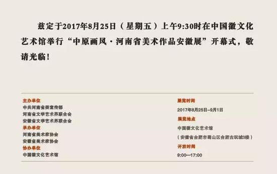 (新浪·艺术中原)近日,从河南省美术家协会获悉,为了迎接党的十九大胜利召开,进一步加强省际美术创作交流,提高艺术创作水平。由中共河南省委宣传部、河南省文联、安徽省文联主办,河南省美术家协会、安徽省美术家协会承办的“中原画风•河南省美术作品安徽展”将于8月25日至9月1日在合肥市中国徽文化艺术馆举办,开幕式定于8月25日上午9:30时举行。