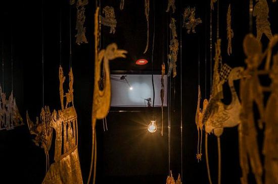 而这样的炫光溢彩也是为展览尾端的幽暗展厅做的铺垫。走入展厅末端的幽暗的小展厅,里面悬挂着的72件工艺精致的牛皮雕刻的皮影,他们被特殊的工艺“染”成了金色,配上灯光,展现着一场关中民俗“社火”的大戏。而在右侧,播放着一段皮影戏视频《降火龙》,一静一动,供观众同时欣赏。