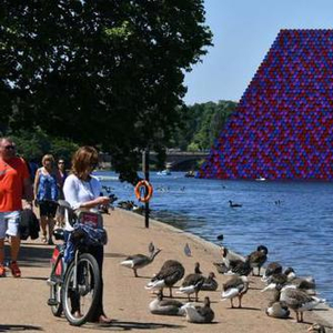 点评:伦敦海德公园的九曲湖上,艺术家克里斯托的巨型油桶雕塑““马斯塔巴””让卫报的评论家不禁想知道这湖里的鱼对此作何感想,因为比起政治宣言,他的作品看上去更像是个石头搭成的节日舞台。