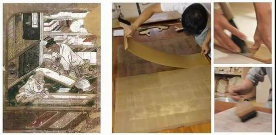 (左)《职人尽绘》(喜多院)江户时代 ,(右) 现代装裱师工作场景