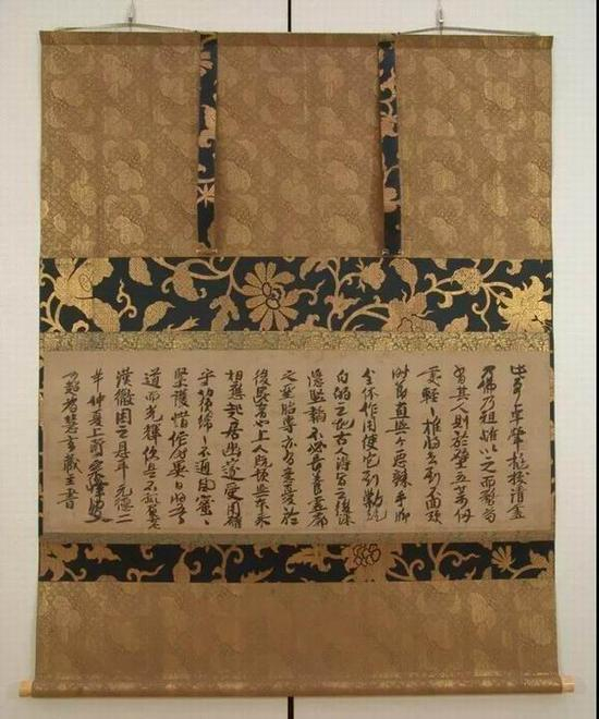 以挂轴为例,中间的书画作品主体被称为“本纸”,即画心,本纸周围的丝织品是“裱装裂地(镶料)”,具有保护和装饰的双重作用,上方垂下两条惊燕(也称“风带”)。这幅《大灯国师墨迹》挂轴完成于14世纪初,当时日本的织锦生产技术尚不成熟,挂轴四周的镶料织锦产自明代时期的中国。