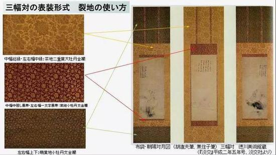 日本书画装裱工艺精细,用料考究,配色极富变化,如何将质地各异、颜色浓丽的织物搭配得宜,与本纸作品相得益彰,是对装裱师审美素养的一大考验。