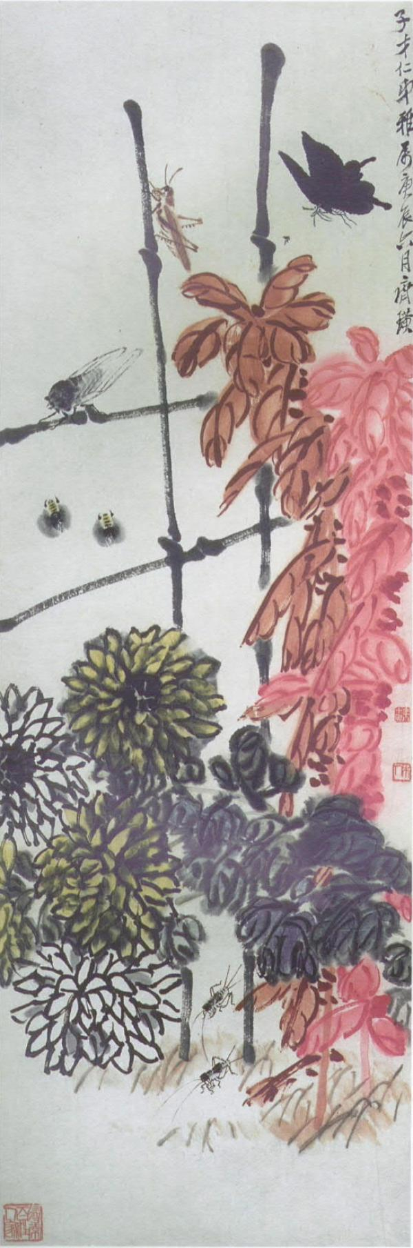 “人喜变更。不独天下官吏行事也。余画亦然。余二十岁后喜画人物。将三十喜画美人。三十后喜画山水。四十后喜画花鸟草虫。或一年之中喜画梅。凡四幅不离梅花。或一年之中喜画牡丹。凡四幅不离牡丹。今年喜画老来红。玉簪花。凡四幅不能离此。如此好变。幸余甘作良民。”这段语含针砭的俏皮话说的很明白,齐白石在创作上求新好变的偏好由来已久,是他的天然本性,“衰年变法”也是这种善变心理的一种自然结果。